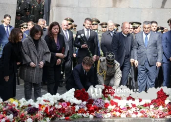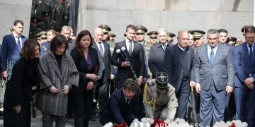 Ermenistan Cumhurbaşkanı Vahagn Khaçaturyan, Başbakan Nikol Paşinyan ve Ulusal Meclis Başkanı Alen Simonyan anıt kompleksine çelenk bıraktı.