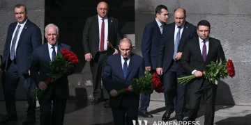 Ermenistan Cumhurbaşkanı Vahagn Khaçaturyan, Başbakan Nikol Paşinyan ve Ulusal Meclis Başkanı Alen Simonyan anıt kompleksine çelenk bıraktı.