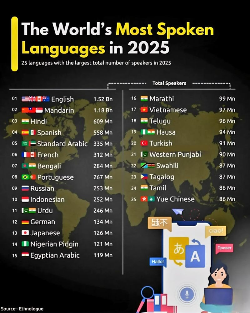 Աշխարհում ամենաշատ խոսվող 20 լեզուների ցանկը ստորև՝