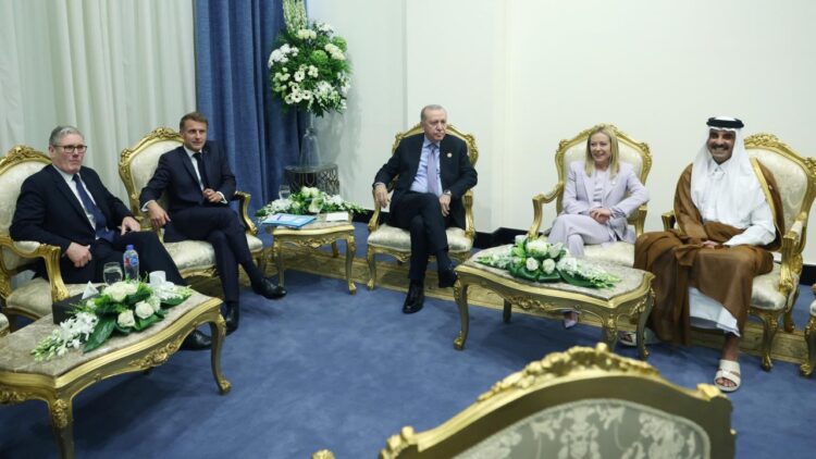 Թուրքիայի նախագահ Ռեջեփ Թայիփ Էրդողանը Եգիպտոսում մասնակցել է Մերձավոր Արևելքի Խաղաղության գագաթնաժողովին։ Այցի շրջանակներում Էրդողանը հանդիպել է մի շարք երկրների ղեկավարների հետ։ Թուրքիայի նախագահի աշխատակազմի հանրային կապերի վարչության տարածած հաղորդագրությունների համաձայն՝ տեղի է ունեցել առանձնազրույցներ Ֆրանսիայի նախագահ Էմանուել Մակրոնի, Իտալիայի վարչապետ Ջորջ Մելոնիի, Մեծ Բրիտանիայի վարչապետ Քիր Սթարմերի, ԱՄԷ փոխնախագահ շեյխ Մանսուր բին Զայեդ Ալ Նահյանի և Կատարի էմիր Թամիմ բին Համադ Ալ Թանիի հետ։