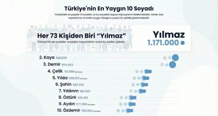 Թուրքիայում միլիոնավոր մարդիկ ունեն նույն ազգանունը։ Ուսումնասիրություն է անցկացվել և պարզվել, թե որոնք ենք ամենատարածված ազգաննուներն այդ երկրում։ Ըստ արդյունքների՝ Թուրքիայում ամեն 73-րդ քաղաքացին ունի նույն ազգանունը՝ «Յըլմազ» (Yılmaz)։ Ցանկը գլխավորող այդ ազգանունը կրում է ավելի քան 1.1 մլն քաղաքացի։ Երկրորդ տեղում «Քայա» (Kaya) ազգանունն է, որը կրում է 888.828 մարդ, իսկ 3-րդ տեղում «Դեմիր» (Demir) ազգանունն է, որը կրում է 864.643 անձ։