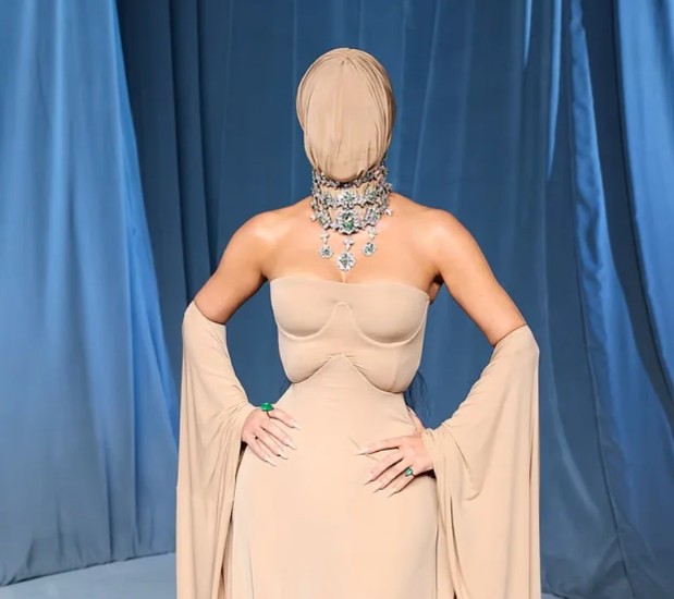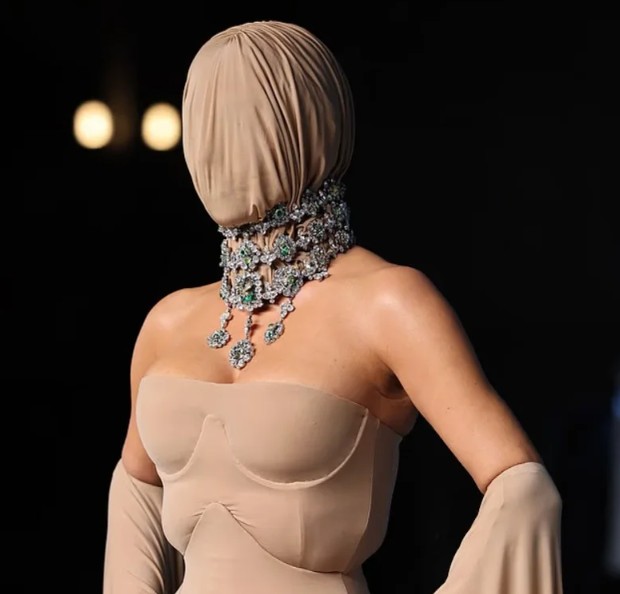 Daily Mail’in haberine göre, 44 yaşındaki Kardashian etkinliğe Maison Margiela imzalı transparan maksi elbise, korsaj ve yüzü kapatan bir maske ile katıldı. Görünümünü zümrüt kolye ve yüzüklerle tamamladı.