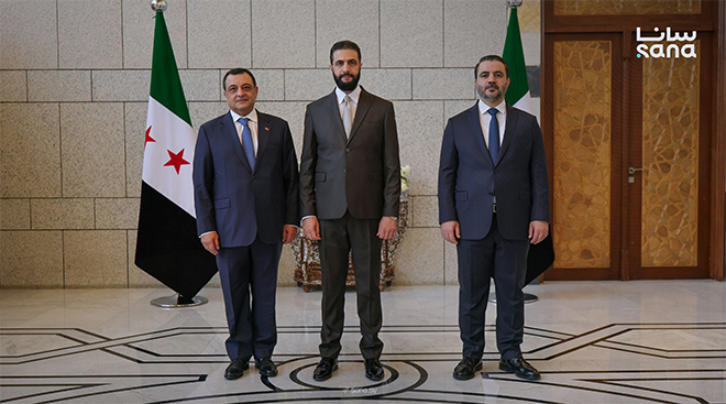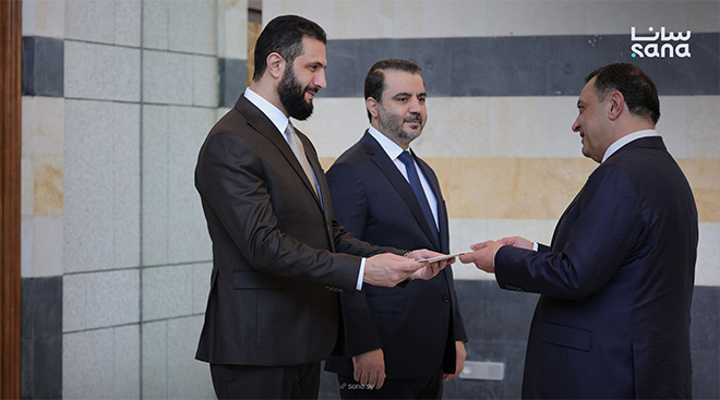Suriye Cumhurbaşkanı Ahmed El Şara, Şam’dak Halk Sarayı’nda, Suudi Arabistan Krallığı’nın Suriye Büyükelçi Faysal bin Suud Al Mucfel ile Ermenistan Cumhuriyeti’nin Suriye Büyükelçisi Ruben Kharazyan’ın Dışişleri ve Gurbetçiler Bakanı Asaad Hasan El Şeybani katılımıyla güven mektuplarını kabul etti.